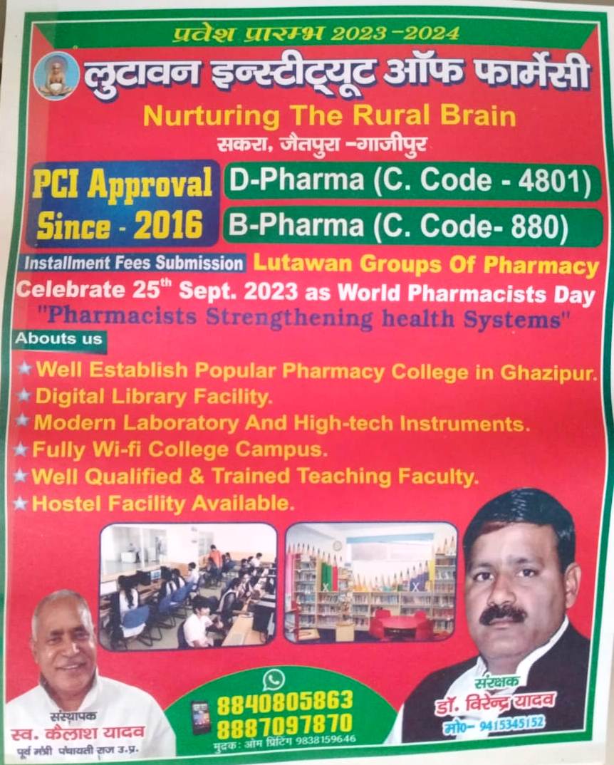Pharmacy is the science and technique of preparing, dispensing, and reviewing drugs and providing additional clinical services. It is a health profession that links health sciences with pharmaceutical sciences and aims to ensure the safe, effective, and affordable use of drugs. The professional practice is becoming more clinically oriented as most of the drugs are now manufactured by pharmaceutical industries. With the advancement of medical science, there has been recurrent demand for qualified and skilled pharmaceutical technologist in this profession. To cater the to this requirement of industry- ready bright professionals, the entrepreneur associated with Lutawan institute of Pharmacy Ghazipur have established in 2016 by three dynamic entrepreneur and educationalist in pharmacy, Lutawan institute of Pharmacy Ghazipur, the college has curved a niche in the field of pharmacy. Since 2016, it has been a premier Pharmacy institute disseminating high quality undergraduate and Diploma in Pharmacy education in Uttar Pradesh. ...